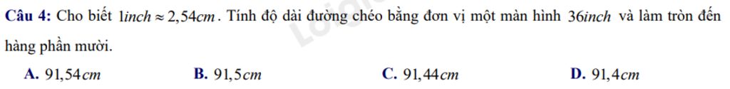 Vậy độ dài đường chéo của TV là `91,4cm`