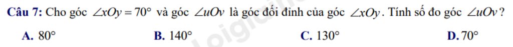 Vì $\widehat{uOv}$ là góc đối đỉnh của $\widehat{xOy}$ mà `2` góc đối đỉnh có số đo bằng nhau
