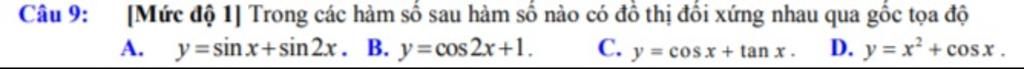 Giải thích các bước giải: Câu B. y = cos(2x) + 1