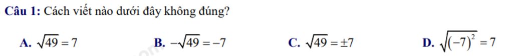 `\bb B. -\sqrt{49}=-7 ->` Đúng (Loại)