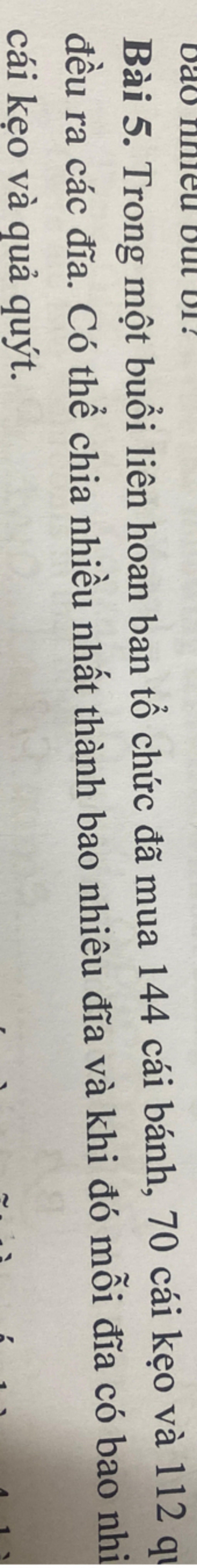 Trong buổi tiệc liên hoan ban tổ chức đã mua 144 cái bánh 70 cái kẹo 112 quả quýt chia đều ra các đĩa Có thể chia được nhiều nhất bao nhiêu đĩa và khi đó mỗi đĩa có bao nhiêu cái bánh cái kẹo và quả quýt