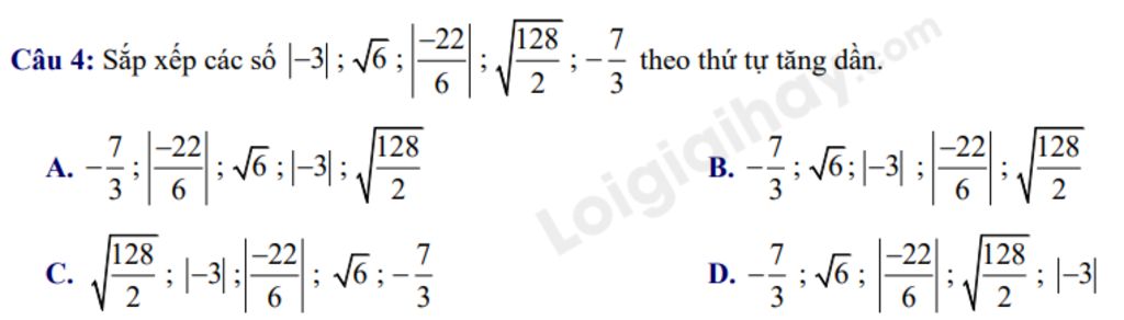 `=>` Sắp xếp theo thứ tự tăng dần là: `-7/3;`$\sqrt{6}$`;``|-3|;``|(-22)/6|``;`$\sqrt{\dfrac{128}{2}}$