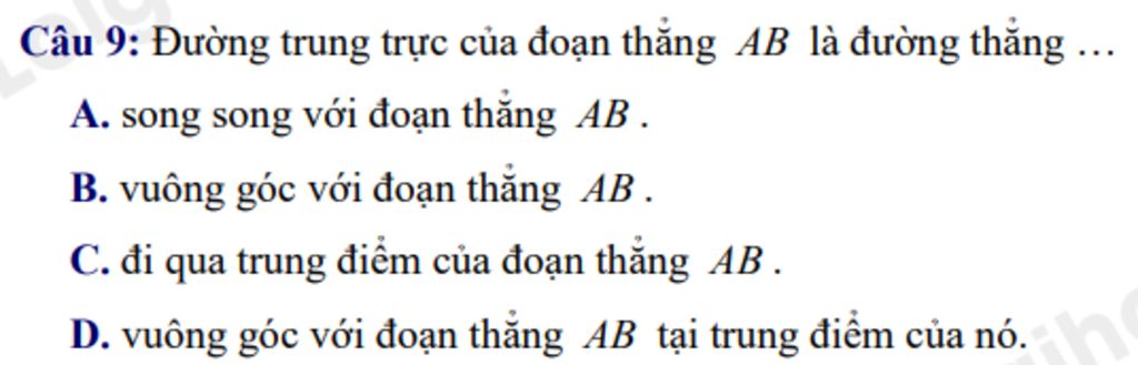 `@` Đường trung trực của đoạn thẳng `AB` là đường thẳng vuông góc với đoạn thẳng `AB` tại trung điểm của nó