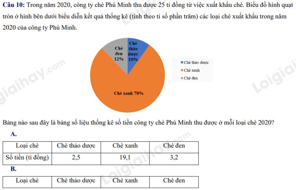 `A.` Loại vì số tiền chè đen thu được là `3` tỉ đồng chứ không `3,2` tỉ đồng.
