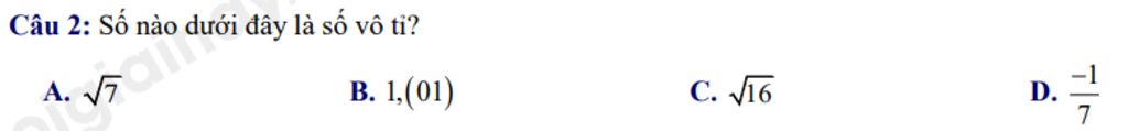 `A` Vì $\sqrt{7}$ `= 2,645751...` `∈ I` `(t//m)`