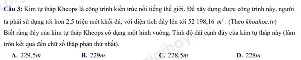 Câu 3: Kim tự tháp Kheops là công trình kiến trúc nổi tiếng thế giới. Để xây dựng được công trình này, người ta phải sử dụng tới hơn 2,5 triệu mét khối đá, với diện tích đáy lên tới 52 198,16m². (Theo khoahoc.tv) Biết rằng đáy của kim tự tháp Kheops có dạng một hình vuông. Tính độ dài cạnh đáy của kim tự tháp này (làm tròn kết quả đến chữ số thập phân thứ nhất).