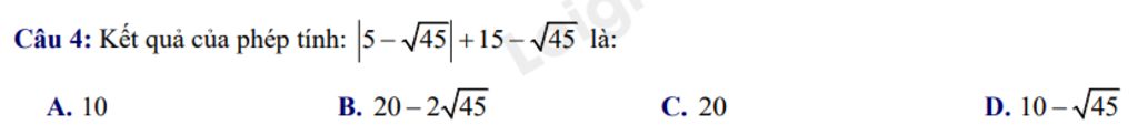 `=sqrt{45}-5+15-sqrt{45}(` Vì `5<sqrt{45})`
