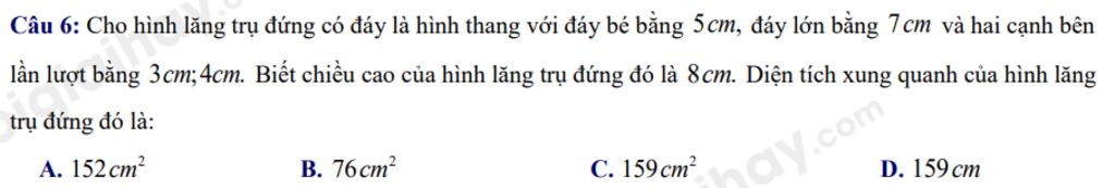 Câu 6: Cho hình lăng trụ đứng có đáy là hình thang với đáy bé bằng 5cm, đáy lớn bằng 7cm và hai cạnh bên