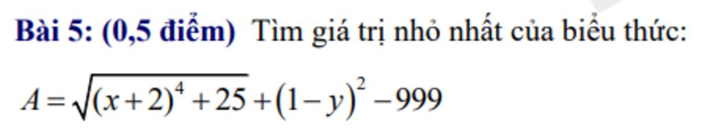 Từ (1) và (2), suy ra: `sqrt((x+2)^2 + 25) + (1-y)^2 + 999 >= 5 + 0 - 999 = -994`
