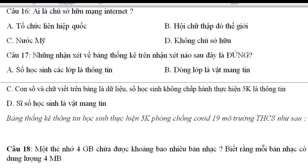 Câu 17: Những nhận xét về bảng thống kê trên nhận xét nào sau đây là ĐÚNG?