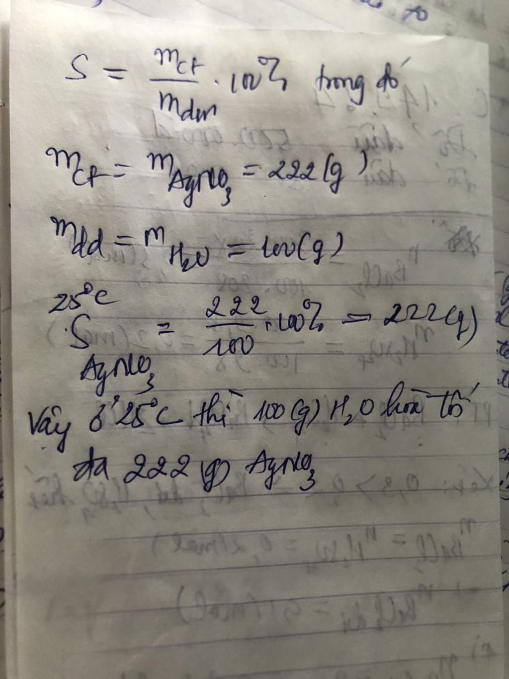 `S_{AgNO_3,25^oC} = (m_{AgNO_3})/(m_{H_2O}) .100 = (222)/(100) .100 = 222(g)`