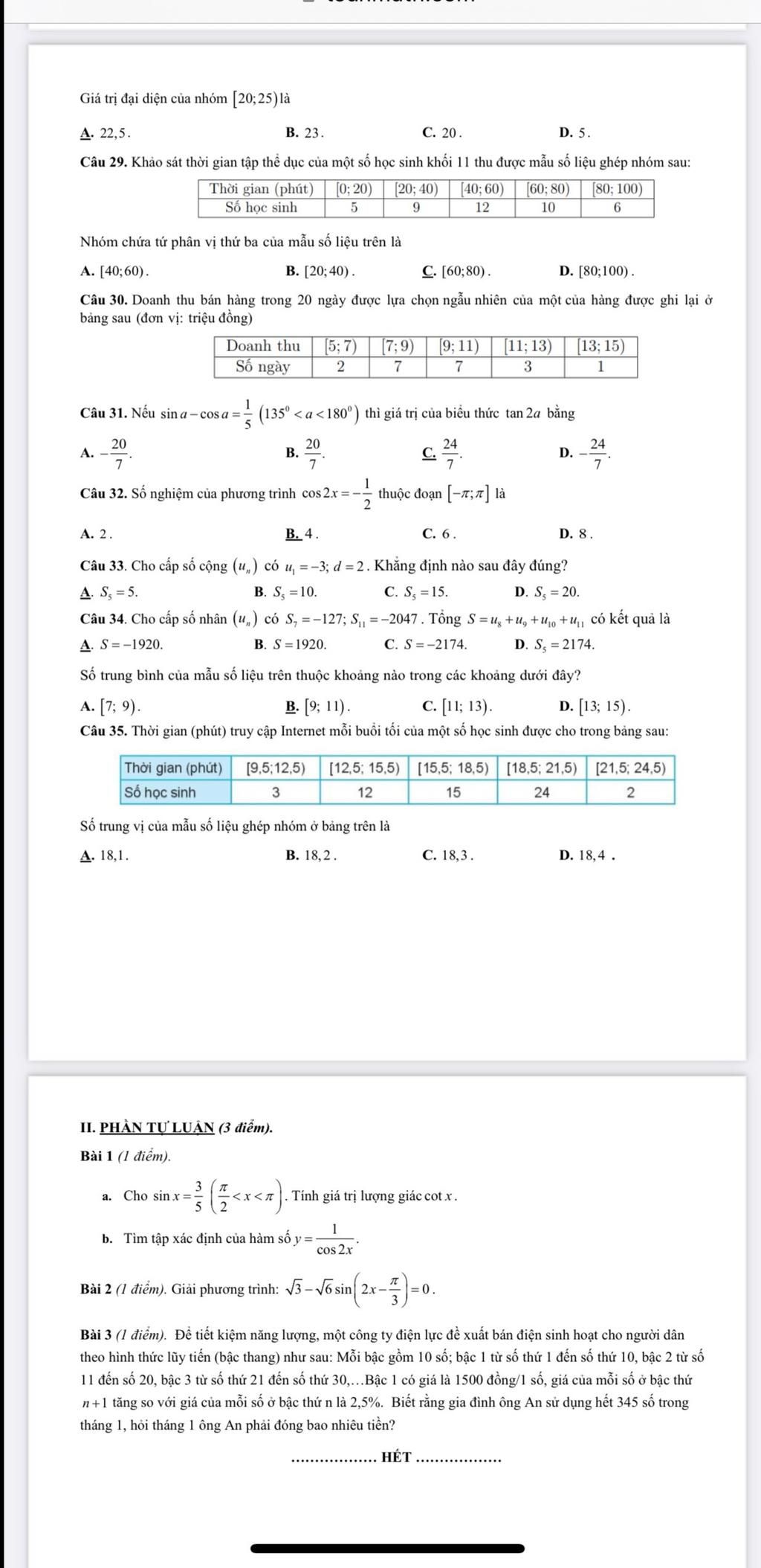 Câu 29. Khảo sát thời gian tập thể dục của một số học sinh khối 11 thu được mẫu số liệu ghép nhóm sau: