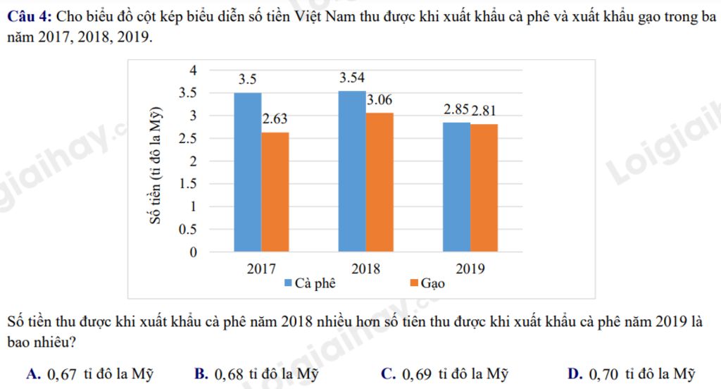 Vậy số tiền thu được khi xuất khẩu cà phê năm `2018` nhiều hơn năm `2019` là `0,69` tỉ đô la Mỹ.