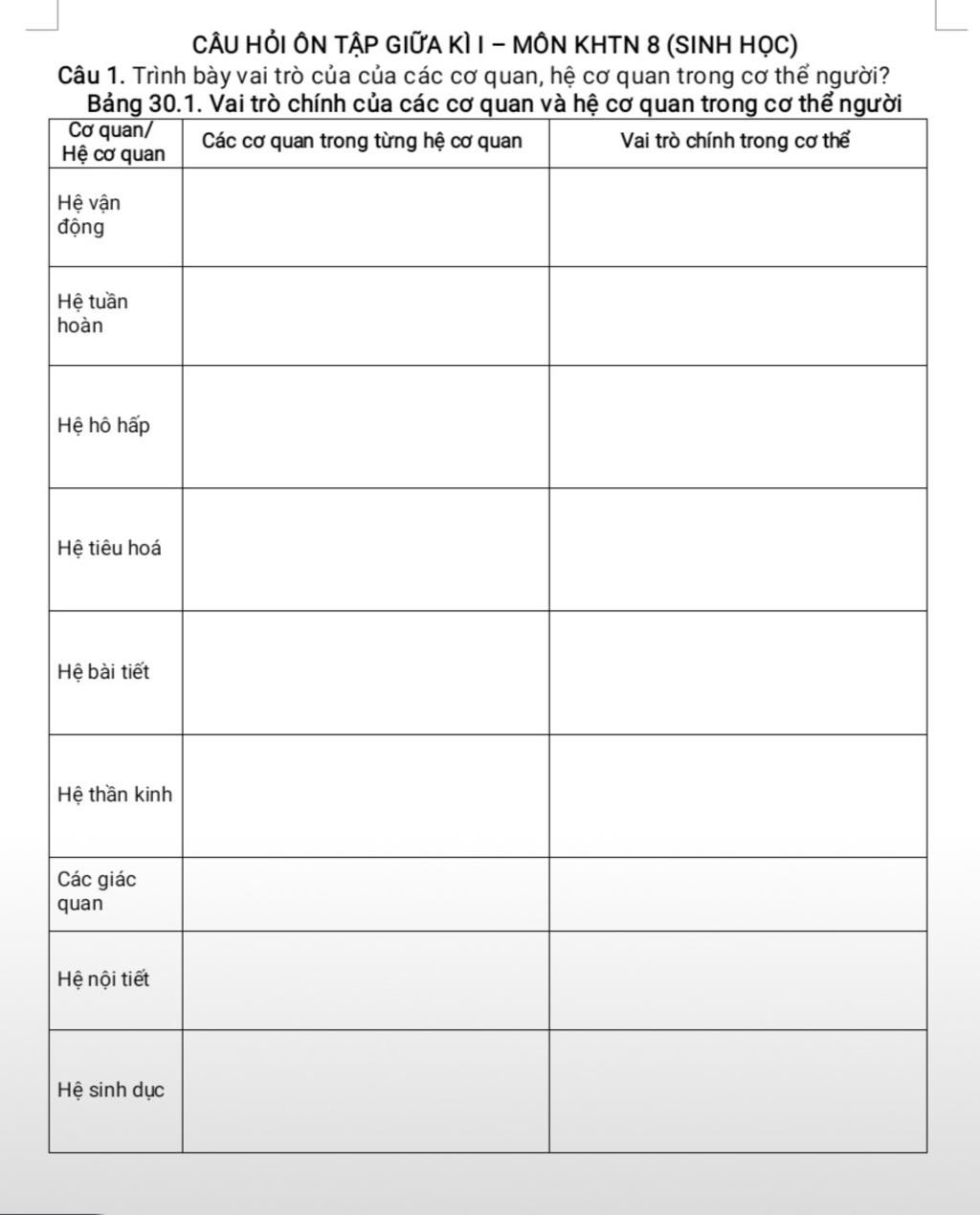 Câu 1. Trình bày vai trò của của các cơ quan, hệ cơ quan trong cơ thể người?