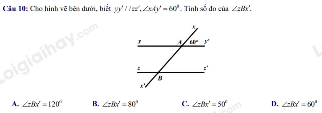 Câu 10: Cho hình vẽ bên dưới, biết yy' // zz', ∠xAy' = $60^o$. Tính số đo của ∠zBx'