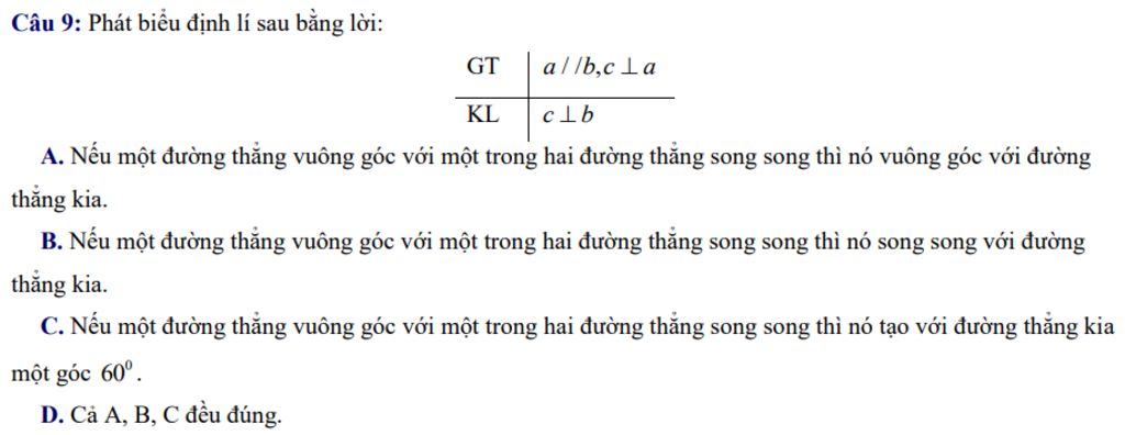 `-`Phát biểu định lí sau bằng lời:Nếu một đường thẳng vuông góc với một trong hai đường thẳng song song thì nó vuông góc với đường thẳng kia