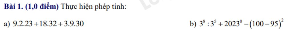 `b)` `3^8:3^5+2023^0-(100-95)^2`