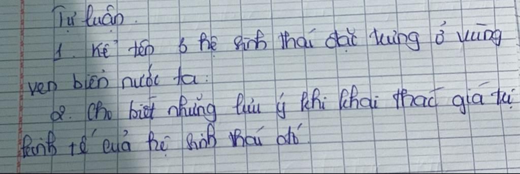 1. Ba hệ sinh thái đặc trưng ở vùng ven biển nước ta bao gồm: