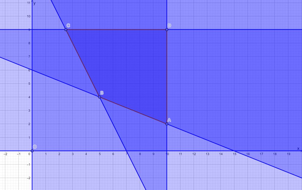 Chi phí ít nhất khi $f(x,y)$ nhỏ nhất tại một trong các điểm $A(10;2); B(5;4);C(2,5;9);D(10;9)$