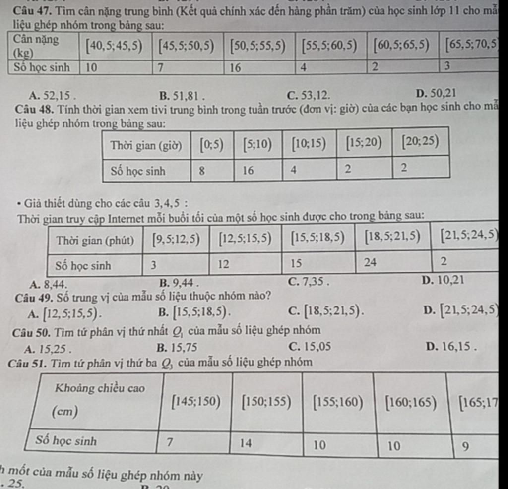 Gọi `x_1;x_2;...;x_56` là thời gian truy cập Internet của `56` học sinh theo thứ tự không giảm