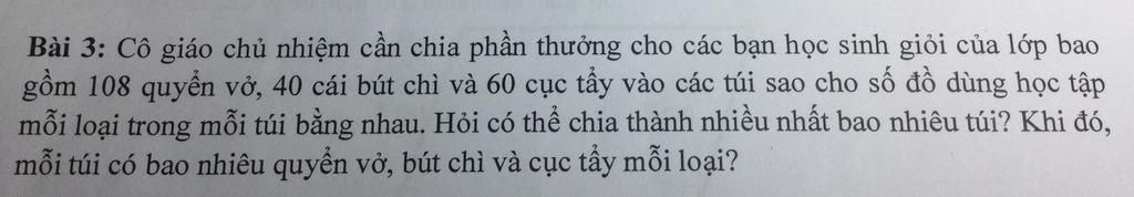 Vậy có thể chia nhiều nhất `4` túi và mỗi túi có `27` quyển vở,`15` cục tẩy và `10` cái bút chì.
