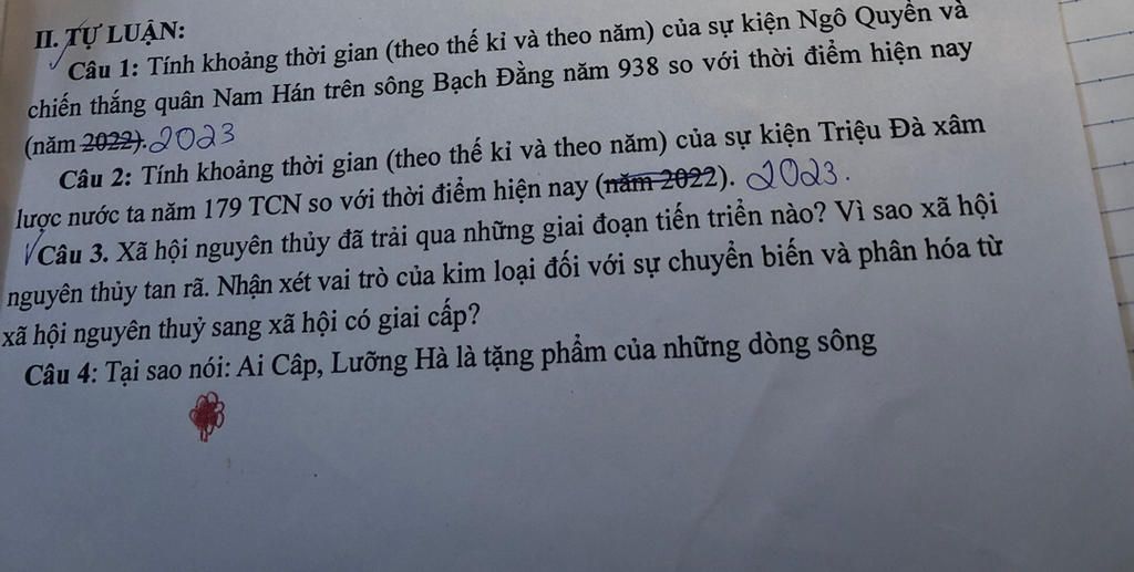 Câu 1: 2023 - 938 = 1085 (năm) ; 1085 ÷ 100 = 10,85 (thế kỉ)