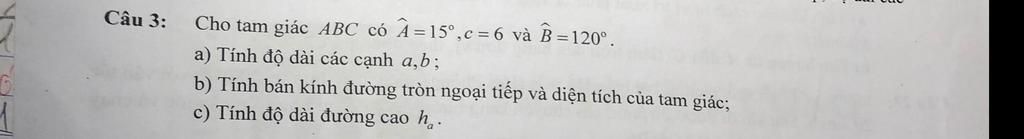 `a/(sinA)=c/(sinC)=>a=(c.sinA)/(sinC)=(6.sin15^0)/(sin45^0)≈2,2`