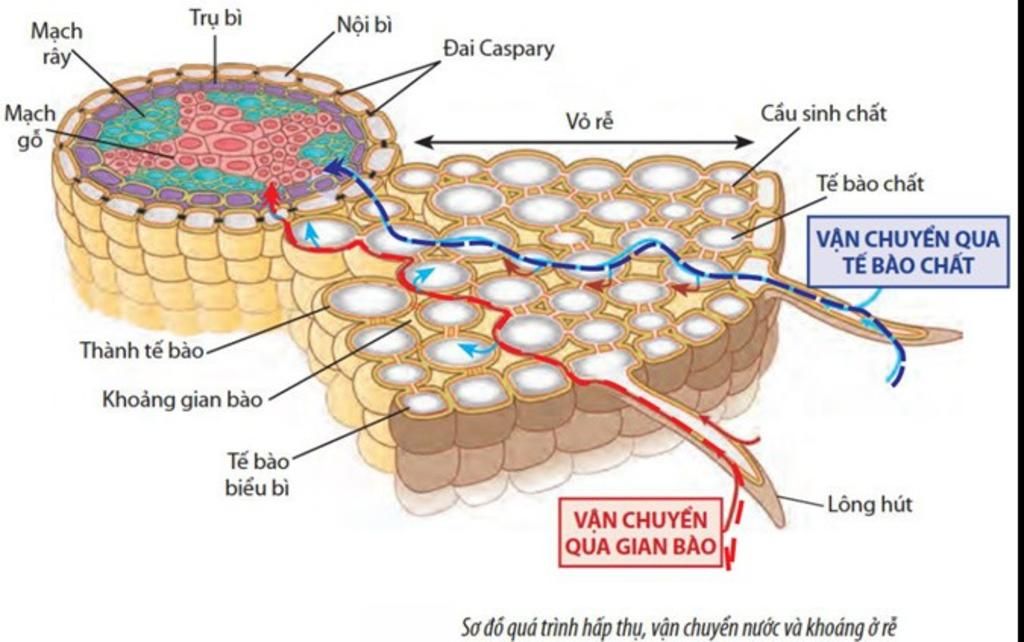 III. Sai. Con đường gian bào: Nước và khoáng di chuyển qua thành của các tế bào và các khoảng gian bào để vào bên trong. Khi qua lớp nội bì có đai Caspary không thấm nước giúp điều tiết lượng nước và khoáng đi vào mạch gỗ của rễ