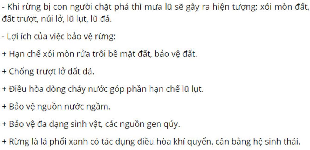 Câu hỏi:Em hãy cho biết khi rừng bị con người chặt phá thì mưa lũ sẽ gây ra hiện tượng gì?Bảo vệ rừng có những lợi ích gì?