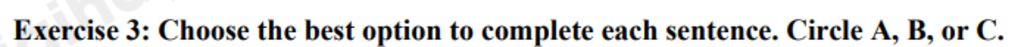 Exercise 3: Choose the best option to complete each sentence. Circle A, B, or C.