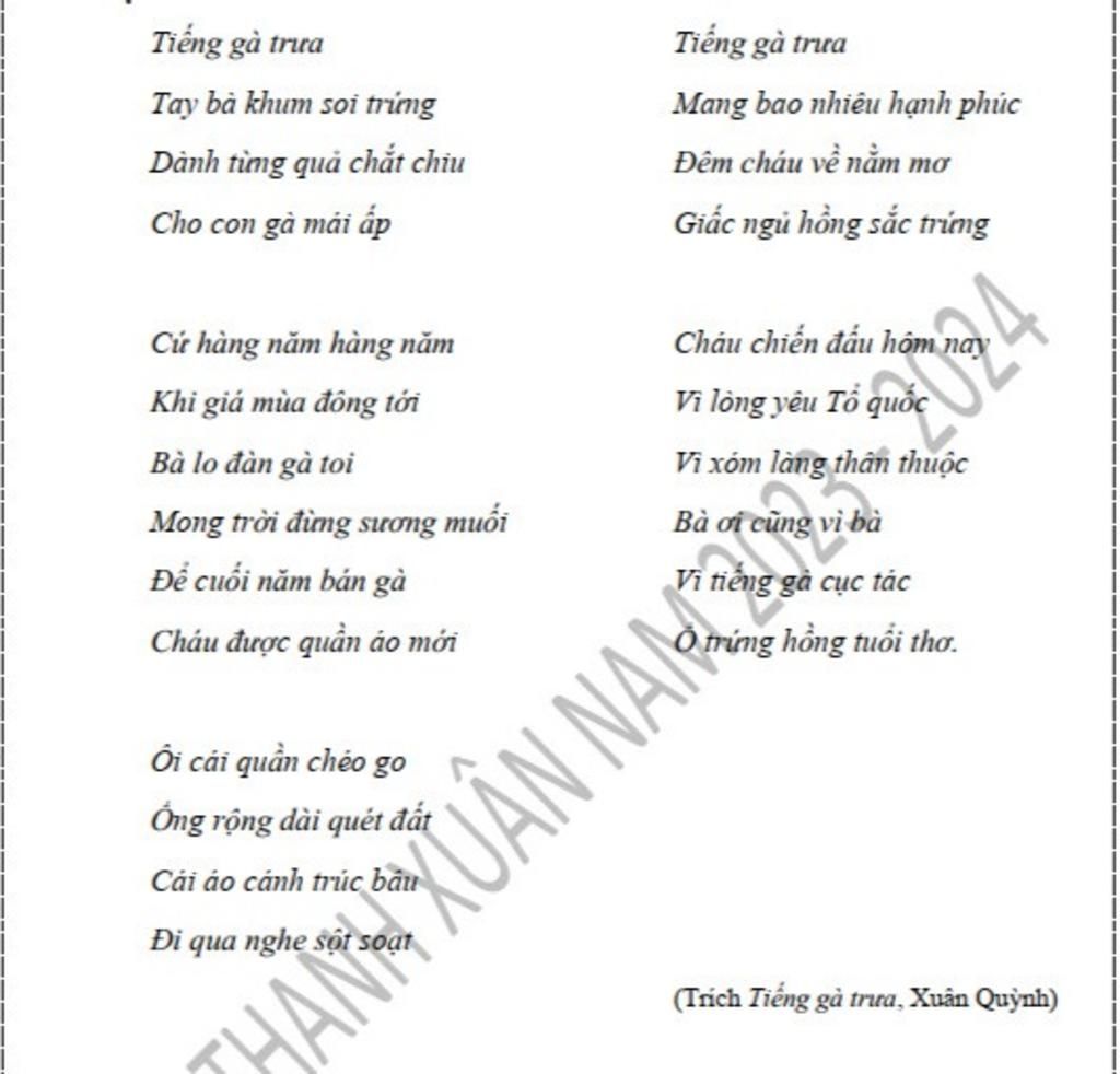 Tình bà cháu là một thứ tình cảm gần gũi, tự nhiên và vô cùng thiêng liêng sâu sắc. Nhà thơ Xuân Quỳnh đã có một bài thơ thật hay khi viết về đề tài giản dị mà gợi bao niềm xúc động này. Đó là bài thơ “Tiếng gà trưa”.Nhân vật trữ tình của bài thơ là người chiến sĩ trẻ tuổi. Theo tiếng gọi của Tổ quốc anh đã tạm cất đi sách vở để lên đường chống Mỹ. Bao trùm bài thơ là nỗi nhớ bà, nhớ quê cồn cào, da diết của anh. Và những kỉ niệm êm đẹp tuổi thơ, tình bà cháu sâu nặng đã làm sâu sắc hơn tình cảm đối với gia đình, quê hương, non sông đất nước