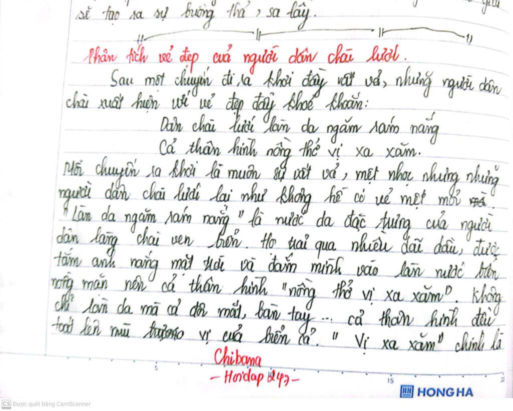 Không hề có dấu hiệu của sự mệt mỏi, biển đêm không khiến con người sợ hãi và yếu đuối. "Làn da ngăm rám nắng" là làn da đặc trưng của người dân vùng chài, vốn đã trải qua nhiều dầu dãi nắng mưa, nay ánh lên sự mạnh mẽ, rắn rỏi. Bước xuống đất liền từ con thuyền chòng chành cập bến, các anh giống như những Thạch Sanh vùng biển: "Cả thân hình nồng thở vị xa xăm". Không chỉ làn da mà còn từ ánh mắt, bàn tay, bước đi, từ "cả thân hình" đều nồng thở cái hương vị mặn mòi của biển cả. "Vị xa xăm" là hương vị từ phương xa, là gió đại dương, là muối đại dương, là nắng đại dương, là hơi thở của đại dương nữa, "xa xăm" vốn là cảm nhận của thị giác, chỉ sự xa xôi, mơ hồ; nay được kết hợp với từ chỉ xúc giác “vị” khiến cho câu thơ trở nên tinh tế vô cùng. Trong từ "nồng thở” còn như ẩn chứa một sức mạnh dồi dào, bền bỉ đã được tôi rèn từ lâu trong tâm hồn để từ làn da, đôi mắt, nụ cười... đều sáng bừng sự sống.