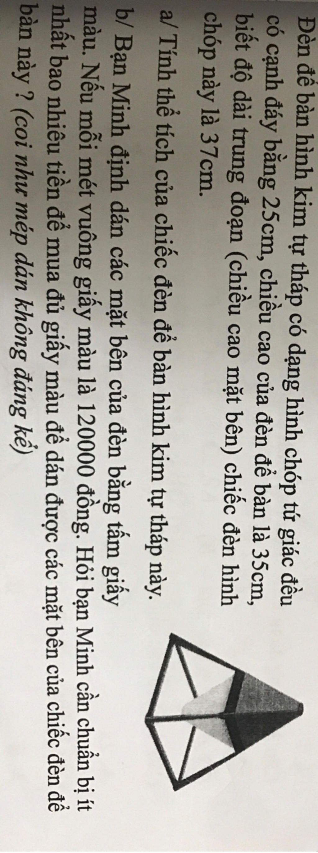 a/ Tính thể tích của chiếc đèn để bàn hình kim tự tháp này.