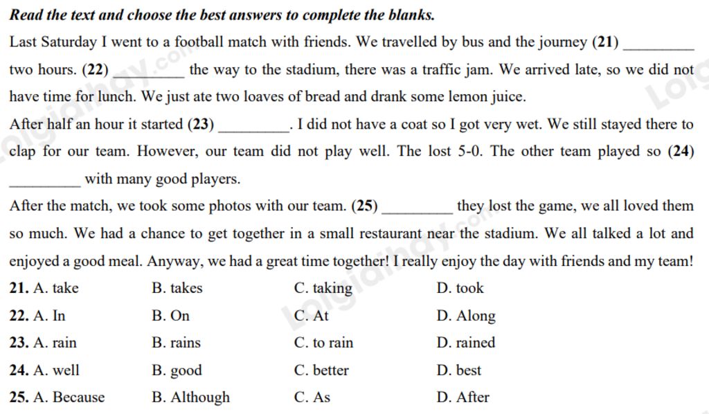 Last Saturday I went to a football match with friends. We travelled by bus and the journey (21) _________ two hours. (22) _________ the way to the stadium, there was a traffic jam. We arrived late, so we did not have time for lunch. We just ate two loaves of bread and drank some lemon juice.