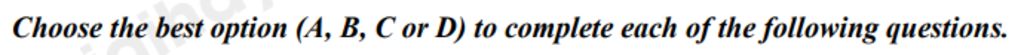 Choose the best option (A, B, C or D) to complete each of the following questions.