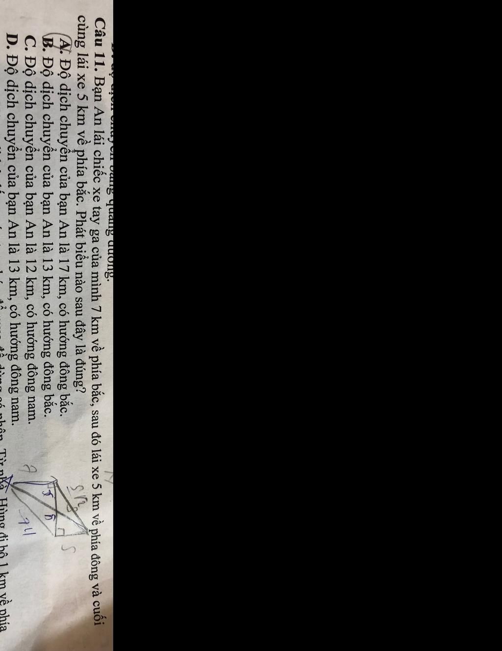 Câu 11. Bạn An lái chiếc xe tay ga của mình 7 km về phía bắc, sau đó lái xe 5 km về phía đông và cuối