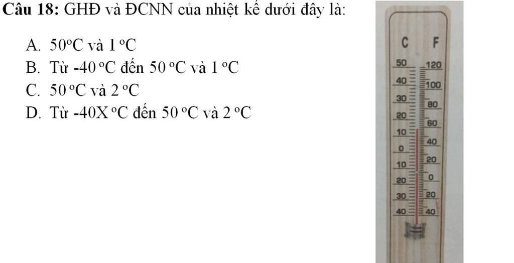 GHD của nhiệt kế là 50`circ`C vì ta thấy 50`circ`C là số đo lớn nhất của nhiệt kế (C)