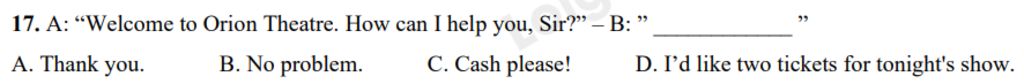 `->` A: “Chào mừng đến với Nhà hát Orion. Tôi có thể giúp gì cho ngài, thưa ngài?”