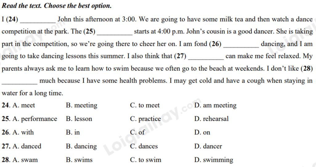 `=>` watch a dance competition`:` xem một cuộc thi nhảy `->` performance`:` buổi trình diễn