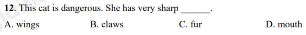 `->` Xét các đáp án, con mèo không có đuôi. lông và miệng của mèo không sắc, nhưng móng vuốt sắc, nên ta chọn claws (móng vuốt)