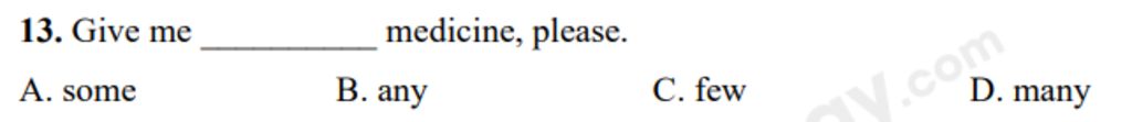 `13.` Give me ______ medicine, please`.`