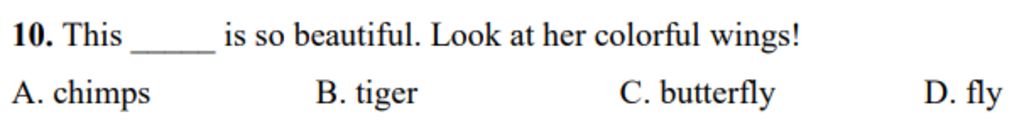 `C`. butterfly: con bướm `->` có cánh sặc sỡ `->` chọn