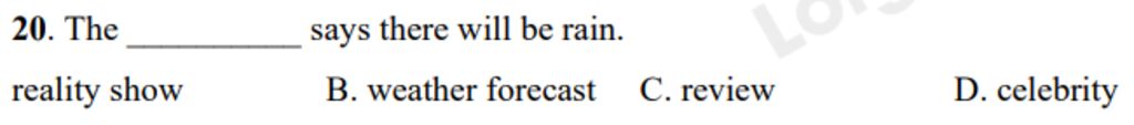 `->` Ở đây nói về thời tiết - chỉ có phương án B hợp lí
