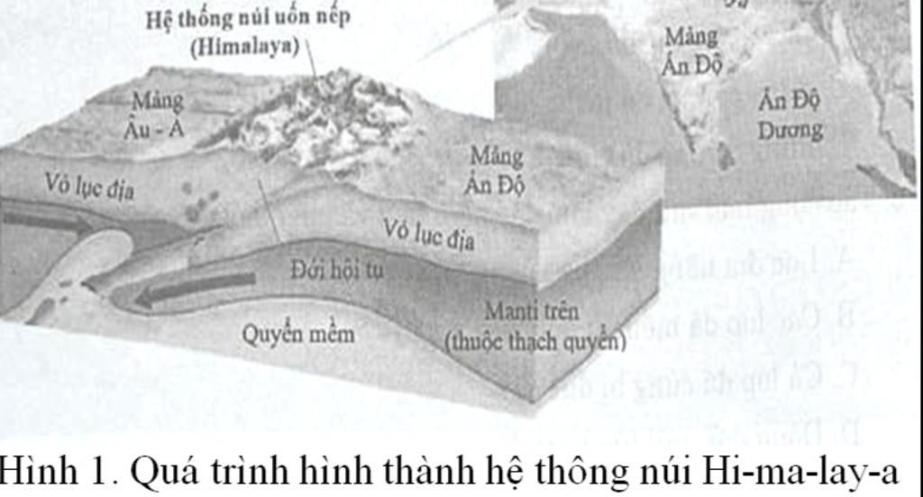== Câu 4: Trên Hình 1. Quá trình hình thành hệ thống núi Hi-ma-lay-a, hệ thống núi Hi-ma-lay-a là hệ quả của dạng tiếp xúc nào sau đây của hai mảng kiến tạo?