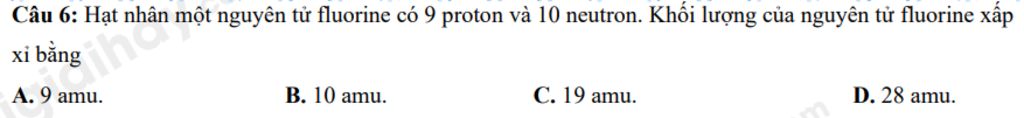 Câu `6:` Hạt nhân một nguyên tử fluorine có `9` proton và `10` neutron. Khối lượng của nguyên tử fluorine xấp xỉ bằng