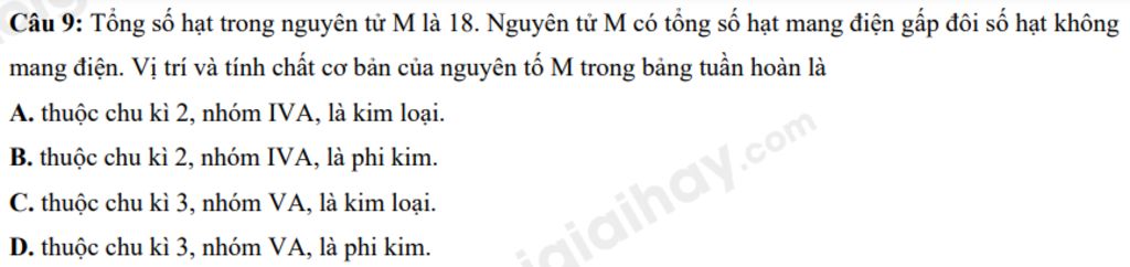 Câu `9:` Tổng số hạt trong nguyên tử M là 18. Nguyên tử M có tổng số hạt mang điện gấp đôi số hạt không mang điện. Vị trí và tính chất cơ bản của nguyên tố M trong bảng tuần hoàn là :