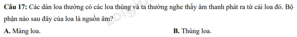 Câu `17:` Các dàn loa thường có các loa thùng và ta thường nghe thấy âm thanh phát ra từ cái loa đó. Bộ phận nào sau đây của loa là nguồn âm?