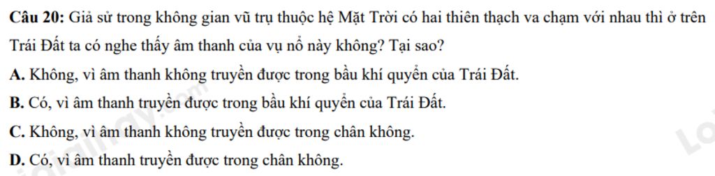 `20`. Trong vũ trụ không thể truyền âm. Suy ra ta không thể nghe thấy âm thanh của vụ nổ khi hai thiên thạch va chạm với nhau.