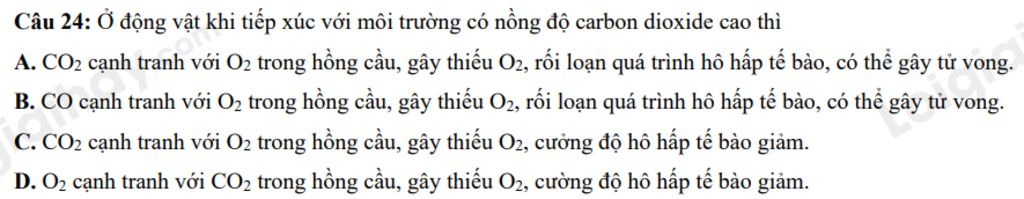 `@ ` Khi tiếp xúc với môi trường có nồng độ `CO_{2} ` cao thì `CO_{2} ` sẽ cạnh tranh với `O_{2} ` trong hồng cầu của động vật.