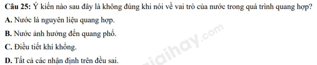 Câu `25:` Ý kiến nào sau đây là không đúng khi nói về vai trò của nước trong quá trình quang hợp?
